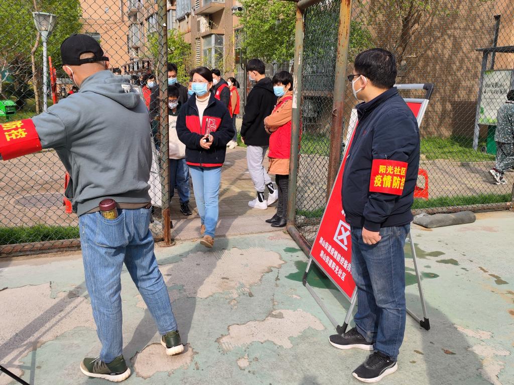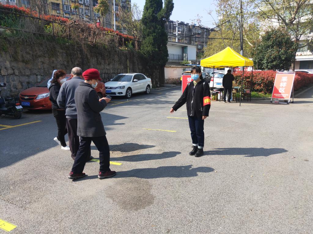 光电物理系党支部书记、系主任李洋以身作则,率先响应,3月28日以来担任阳光社区疫情防控志愿者。连续多日,在社区引导检测人群队伍,协助医务人员开展核酸检测工作。