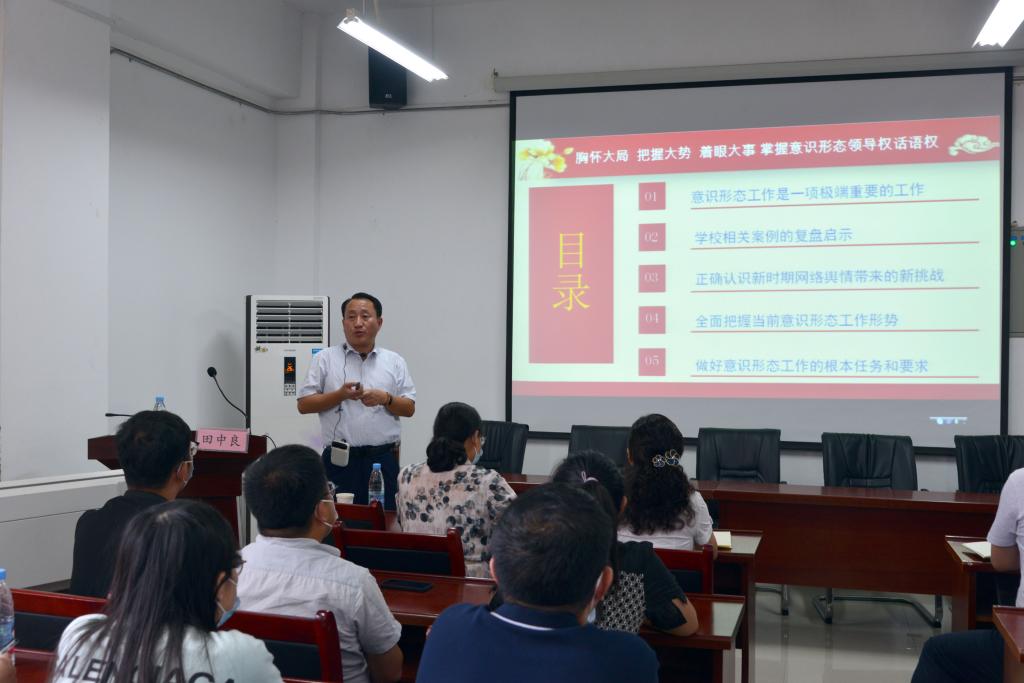 9月2日下午,yl23455永利官网在明道楼报告厅举办意识形态工作专题辅导报告会,校党委宣传部、统战部常务副部长田中良作了《胸怀大局、把握大势、着眼大事,牢牢把握意识形态领域领导权话语权》的辅导报告。yl23455永利官网党委理论学习中心组成员、科级干部、全院教职工参加了报告会。学院党委书记刘艳主持会议。