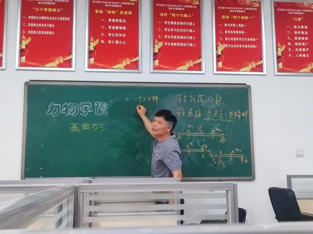 “我很高兴,以这种方式再次回到课堂,又见到我的同事。”陈树峰老师在交流会上说。他深情地回顾了自己从煤矿到高校的工作经历,分享了从教二十五年的心路历程。从理论力学、材料力学、工程力学、流体力学,说到一门门课程、一届届学生,他如数家珍、娓娓道来。讲到投入之时,陈老师现场拿起粉笔,在黑板上挥洒如行云流水,就《理论力学》中的静力学和运动学两大部分的重点难点内容,结合典型例题,逐一给老师们示范讲解、总结归纳。他详细入微地讲解了约束类型及约束反力画法、受力图中准确识别二力构件的重要性、摩擦问题、点的合成运动中动点动系的选取及动能定理的应用。从宏观总结到细节归纳,化抽象为形象,使深奥的力学理论变得通俗易懂,加深听者对力学概念的印象。他的热情和激情,让大家感受到不一样的课堂“温度”。